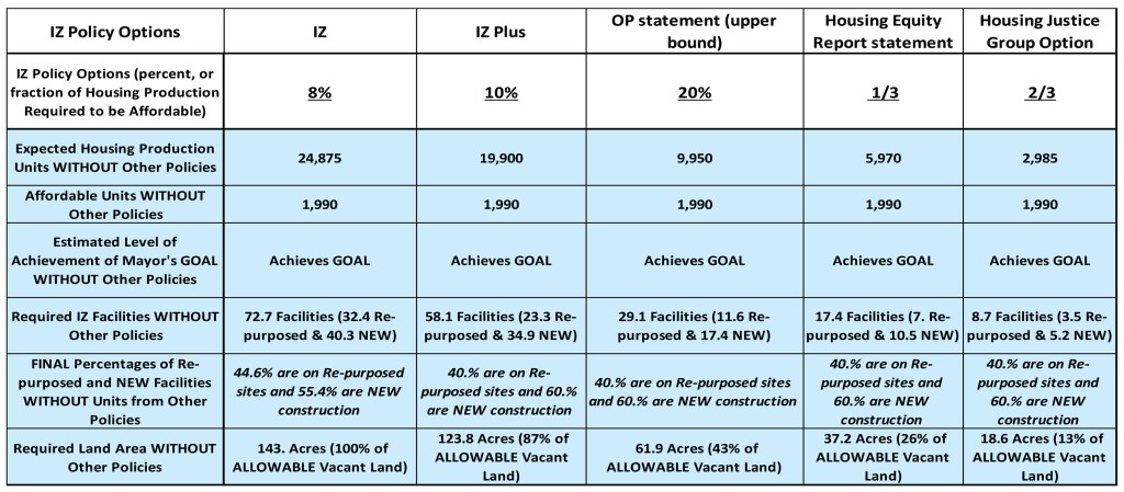 Focusing on the top blue row of the OUTPUT TABLE below, we can see that the housing production required to achieve the Mayor’s goal for Rock Creek West is totally unrealistic using ONLY inclusionary zoning (IZ) policies. The first three columns of that row indicate that housing production would have to be almost 10,000 units even if the IZ policy could be 20% and over 24,000 with an IZ policy of 8%.
