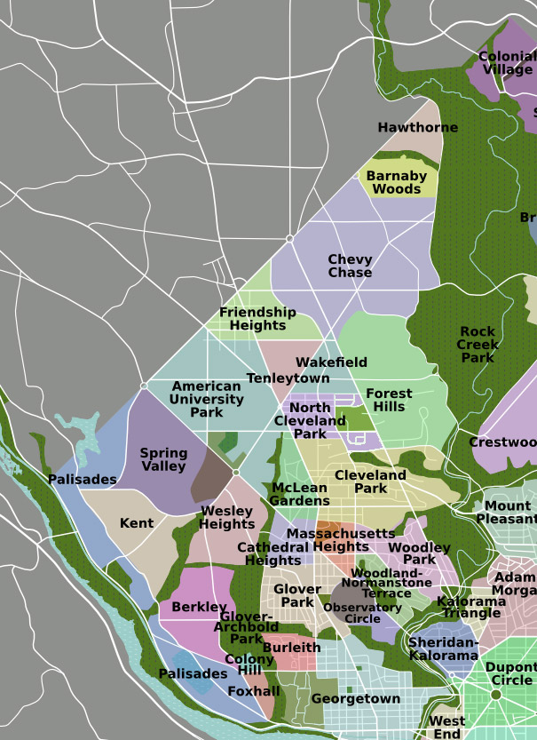 Ward 3 is located in the upper North West quadrant of Washington, D.C. It encompasses the neighborhoods of American University Park, Berkley, Cathedral Heights, Chevy Chase, Cleveland Park, Colony Hill, Forest Hills, Foxhall, Friendship Heights, Glover Park, Kent, Massachusetts Heights, McLean Gardens, North Cleveland Park, The Palisades, Spring Valley, Tenleytown, Wakefield, Wesley Heights, Woodland-Normanstone Terrace, and Woodley Park. It borders the State of Maryland along Western Avenue, Ward 4 along Broad Branch Road at 27th Street, Ward 1 through Rock Creek Park, Ward 2 at Whitehaven Parkway and Glover-Archbold Park, and the Commonwealth of Virginia at the far shoreline of the Potomac River.